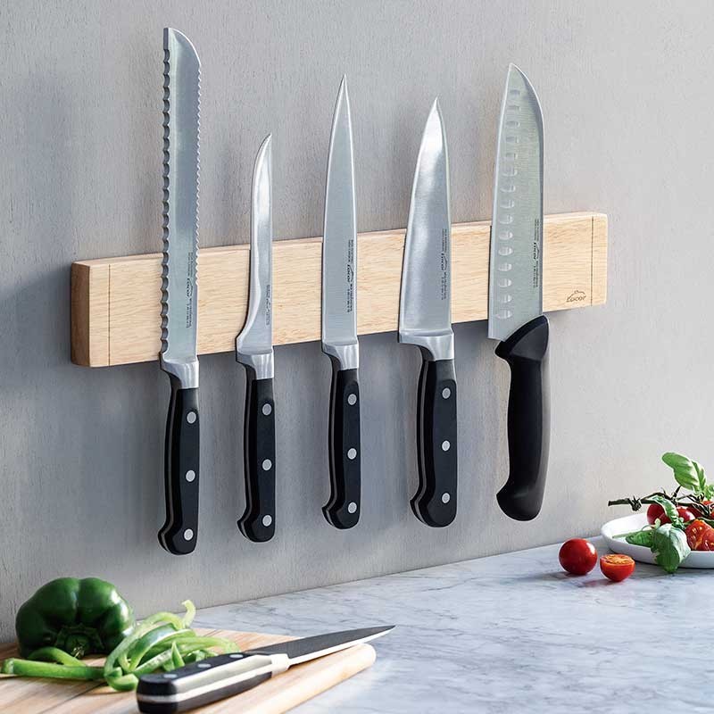 Élégant support magnétique pour couteaux de cuisine fabriqués en caoutchouc, en bois. Comprend tout le nécessaire pour l'assemblage.