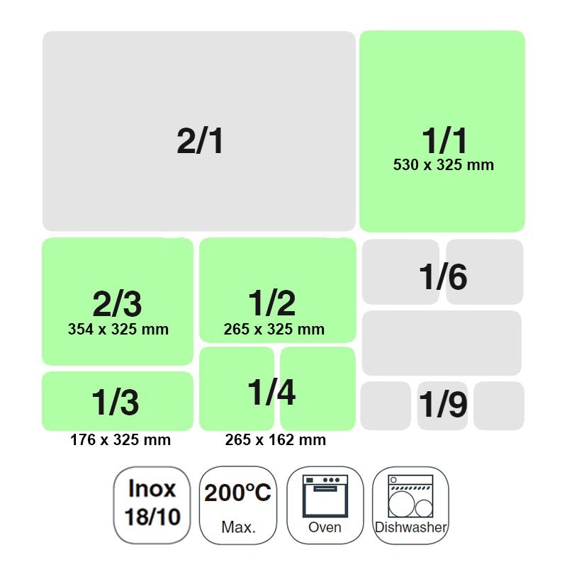 Ces conteneurs peuvent être de plusieurs tailles standard, jusqu'à un total de 9 tailles différentes et de construction, peut varier en fonction de l'usage auquel ils sont destinés, parmi lesquels vous pouvez trouver de l'acier inoxydable, polycarbonate, polypropylène, mélamine et même de porcelaine.