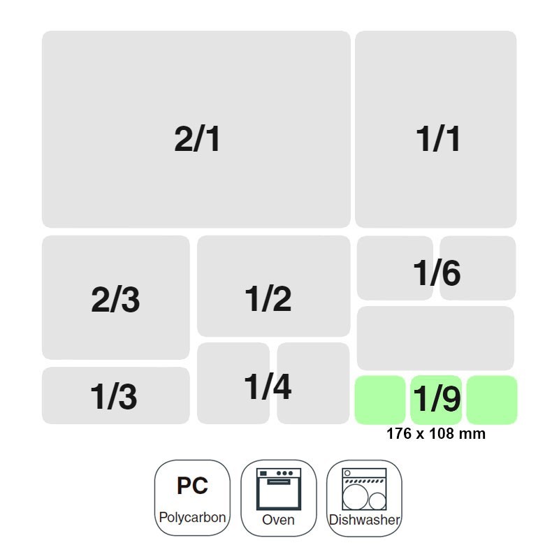 La taille de la gouttière GN 1/9 de 176x108 mm pour les cuisines professionnelles de haute qualité en polycarbonate léger et non déformable.