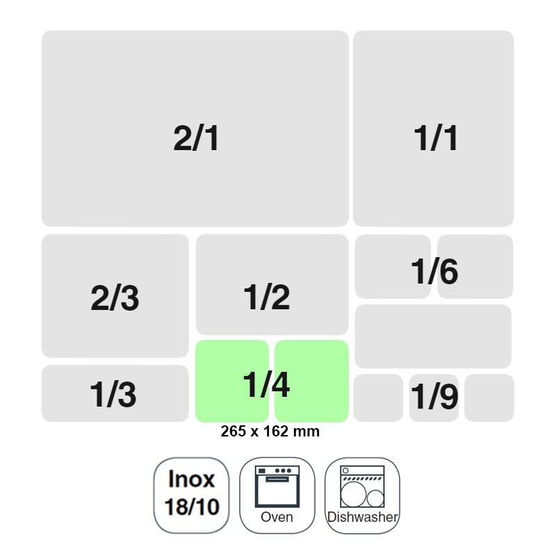 Un seau ou un bac de taille GN 1/4 265x162 mm pour les cuisines professionnelles en inox 18/10.