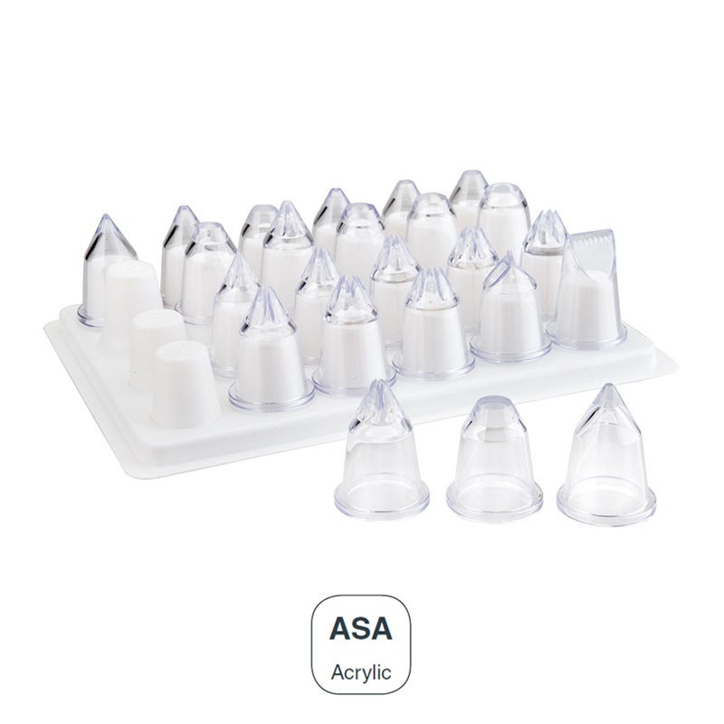 Ensemble avec 24 buses de la pâtisserie variés pour décorer avec une poche à douille, faites de plastique acrylique de haute qualité et résistance.