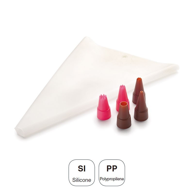 Ensemble composé d'une poche à pâtisserie de 800 ml et 30 cm en silicone, plus de 5 buses en polypropylène de différentes formes pour la décoration.