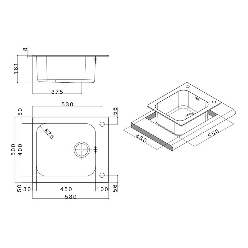 Évier en satin modèle en acier inoxydable Rome 580 x 500 mm pour une installation sur un comptoir.