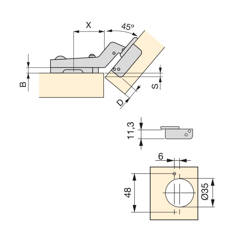 Charnières avec bras à angle spécial pour portes de meubles type de pièces de coin ou en angle. Mise en lumière par le piston de l'amortisseur qui fournit une fermeture en douceur de la porte. Ils sont disponibles dans une version avec bras à angle de 45 ° avec une ouverture de porte à 95º. Pour votre installation nécessite un forage préalable de 35 mm de diamètre pour la coupe. Et leur attachement pour le conseil d'administration est effectuée par le moyen des vis fournies. Il se distingue également par sa facilité d'installation grâce au système automatique de clip de fixation de la charnière pour le supplément. En plus, les deux ont excentrique vis pour un réglage rapide et un ajustement confortable. La fixation du complément est fait avec vis de l'Euro qui nécessite une perceuse avant ø 5 x 12 mm utilisé dans les conseils d'administration avec la fermeture à glissière trou.