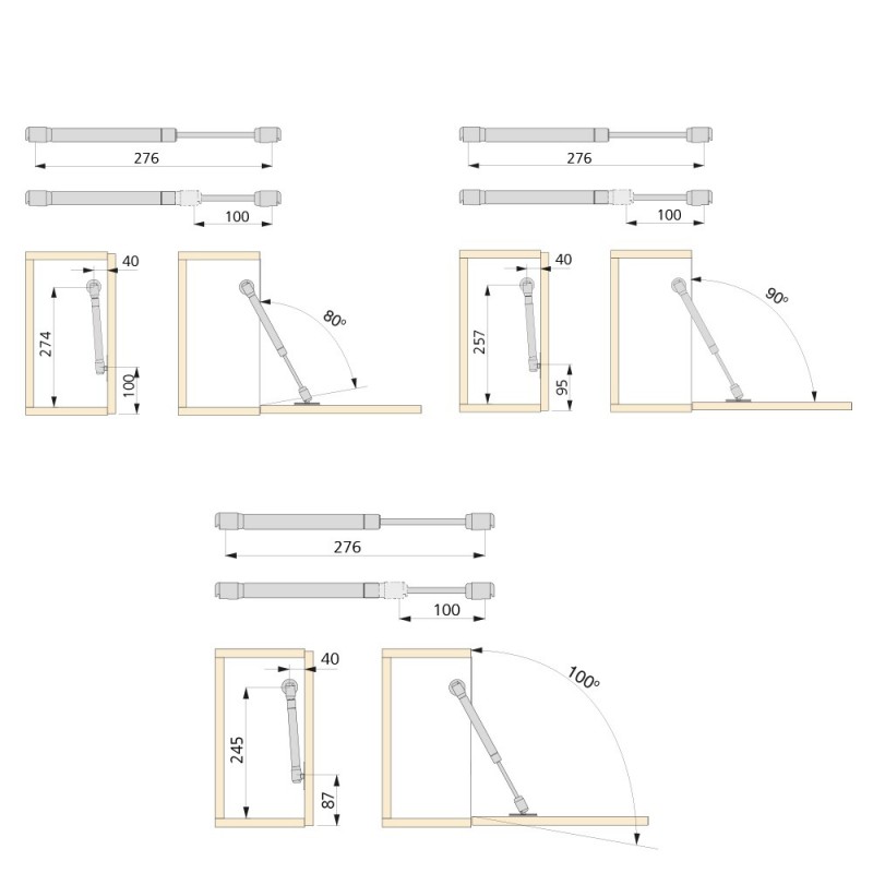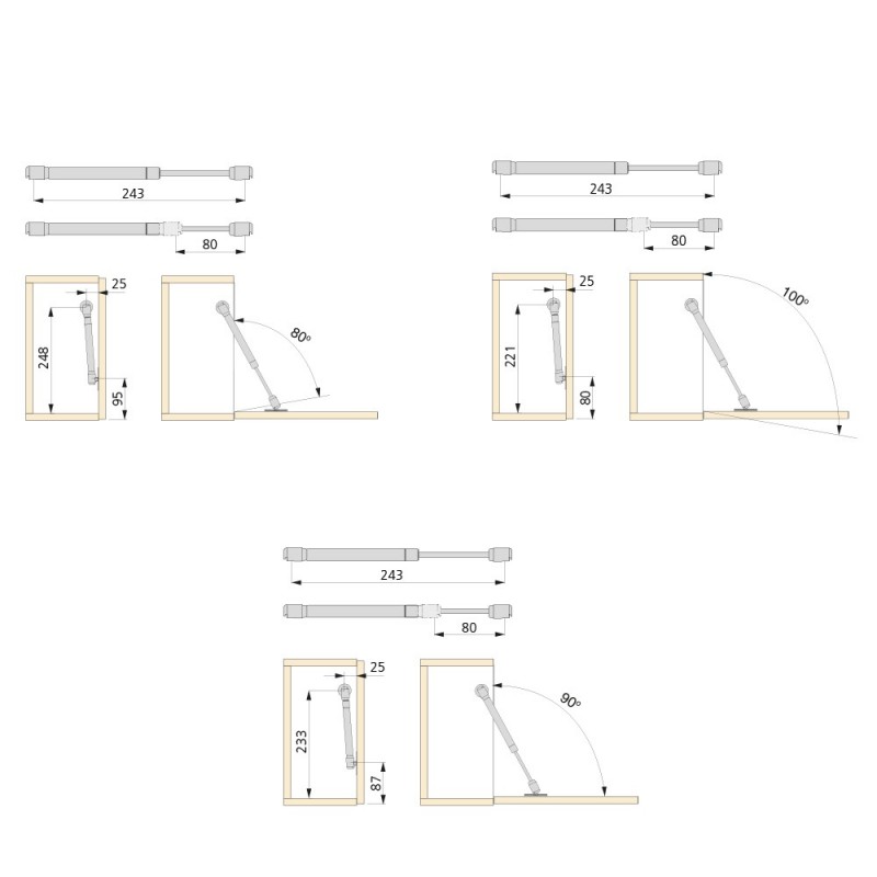 Vérins pour meubles qui permettent l'ouverture des portes en bois ou avec un cadre en aluminium. Fournissent une descente amortie de la porte abattante dans les meubles de cuisine, maison et salle de bain.