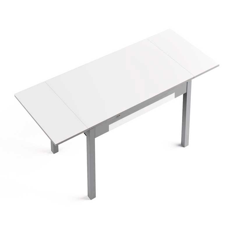 Ensemble de meubles de cuisine composé d'une table extensible en plateau stratifié blanc de 19 mm d'épaisseur avec bords en PVC blanc et de 2 extensions avec guides automatiques (un à chaque extrémité) de 30 cm chacun, tiroir avec guides métalliques d'extraction totale et pieds carrés en acier de 50x50 mm en couleur aluminium époxy.