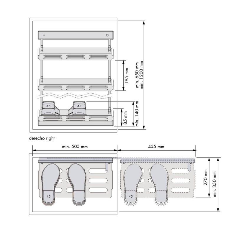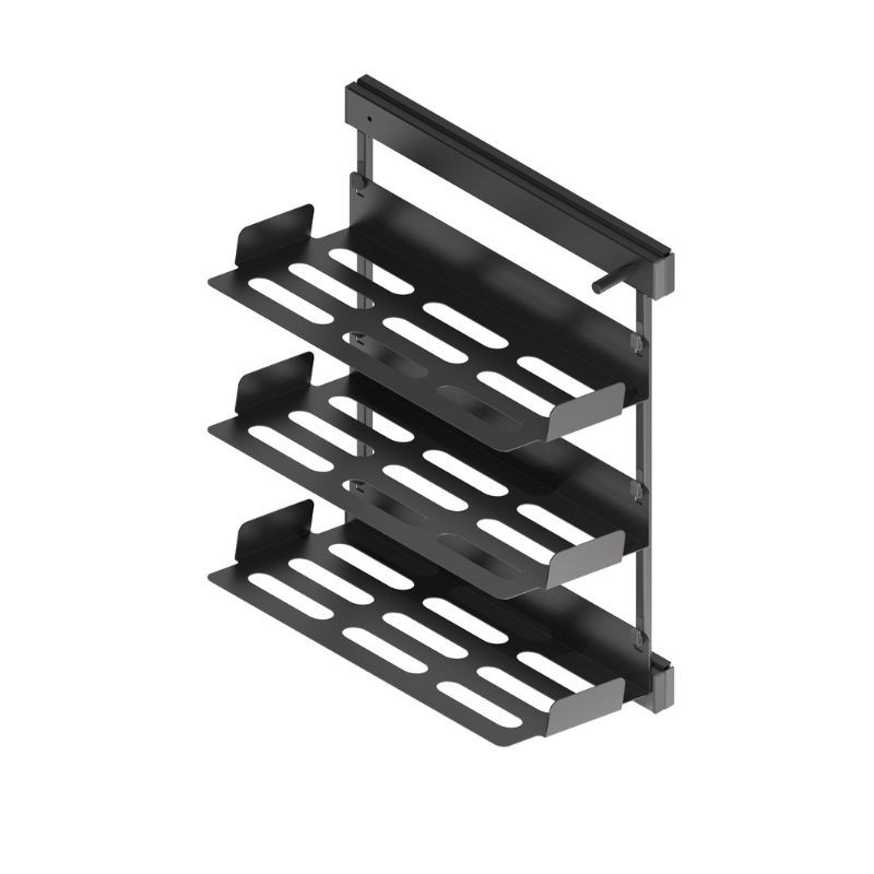 Plateaux en acier peint en couleur anthracite pour former un meuble à chaussures idéal pour votre armoire ou dressing. Il dispose d'une fermeture amortie et d'une extraction totale. Supporte une charge maximale de 30 kg.