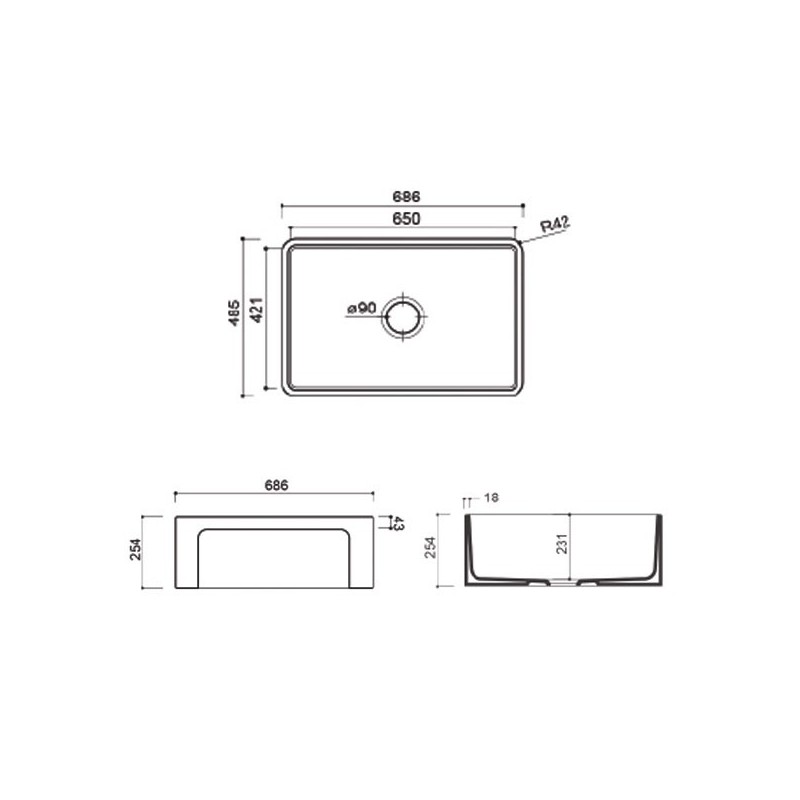 Lavabo en céramique blanche modèle Lagon 27 686 x 485 mm, pour le montage sur le comptoir ou sous le comptoir.