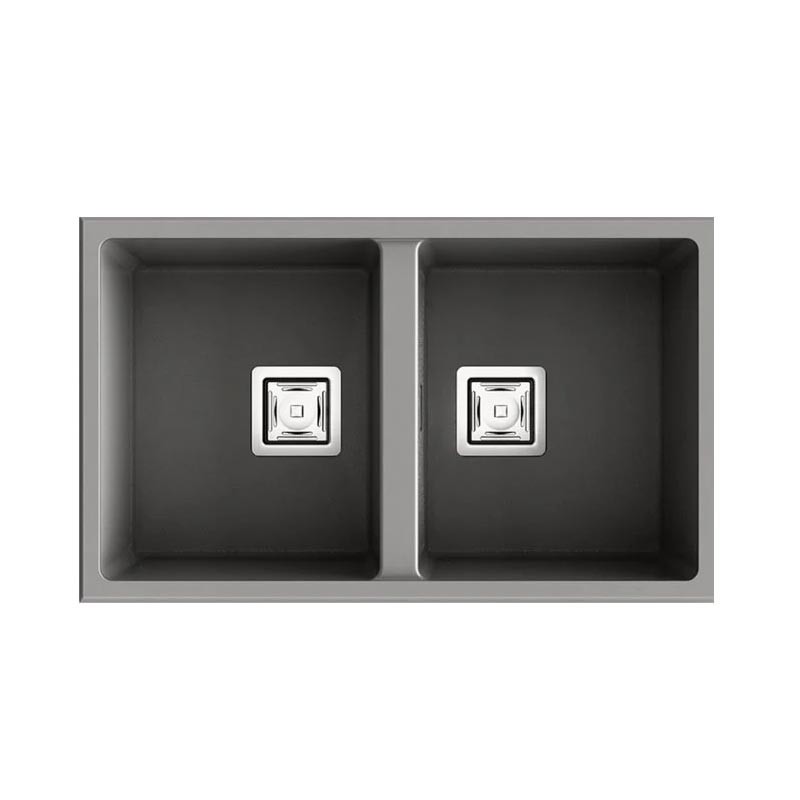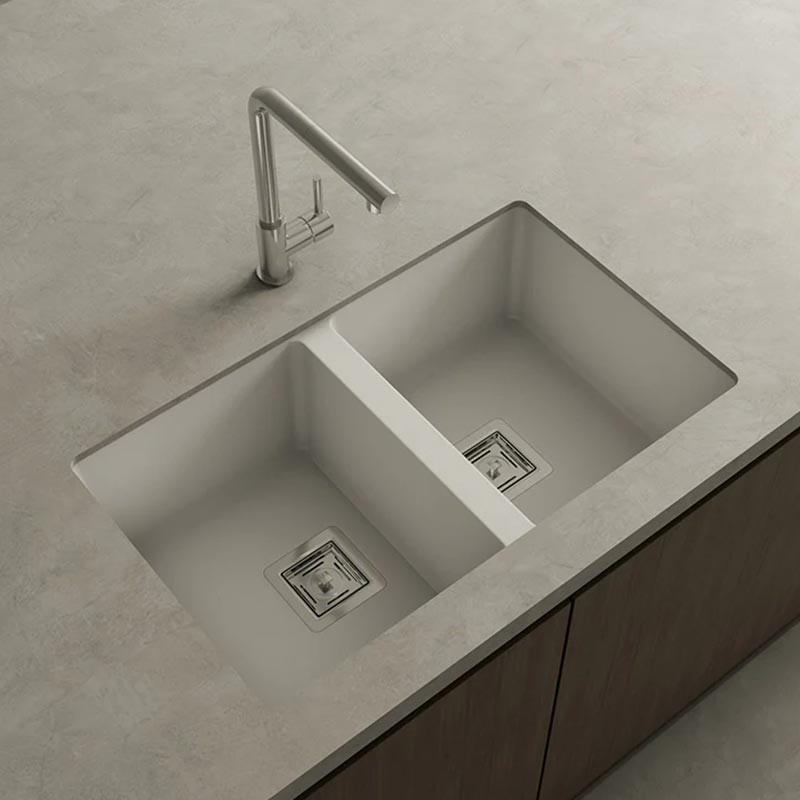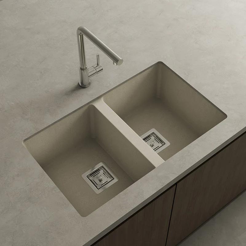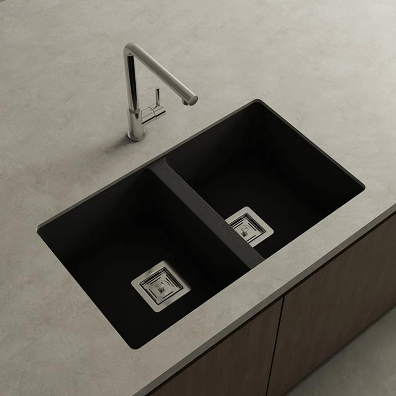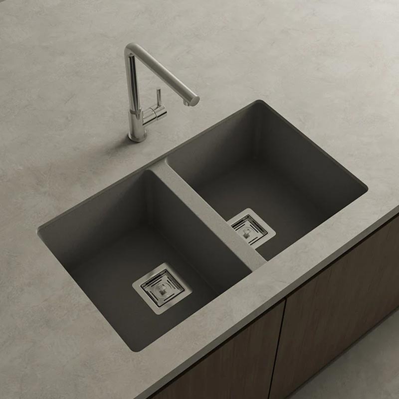 Évier en granit Hekla® modèle Zie 70 à deux bacs finition mate conçu pour une installation sous plan ou sur plan dans des meubles de 80 cm minimum.