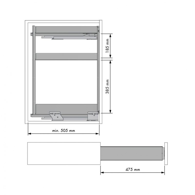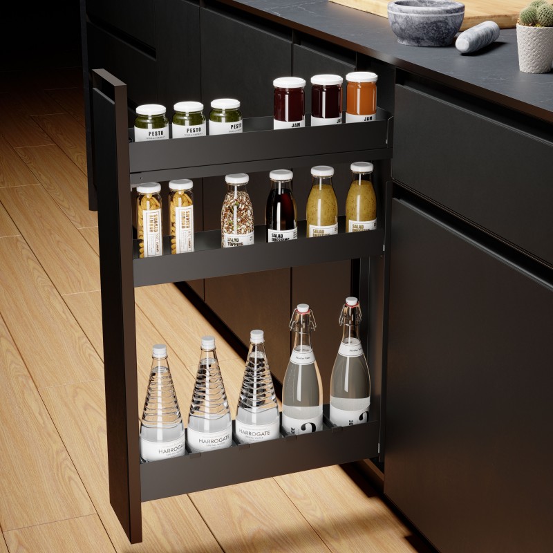 Module extractible pour meuble de cuisine pour le rangement de bouteilles, bocaux, épices et petits récipients.