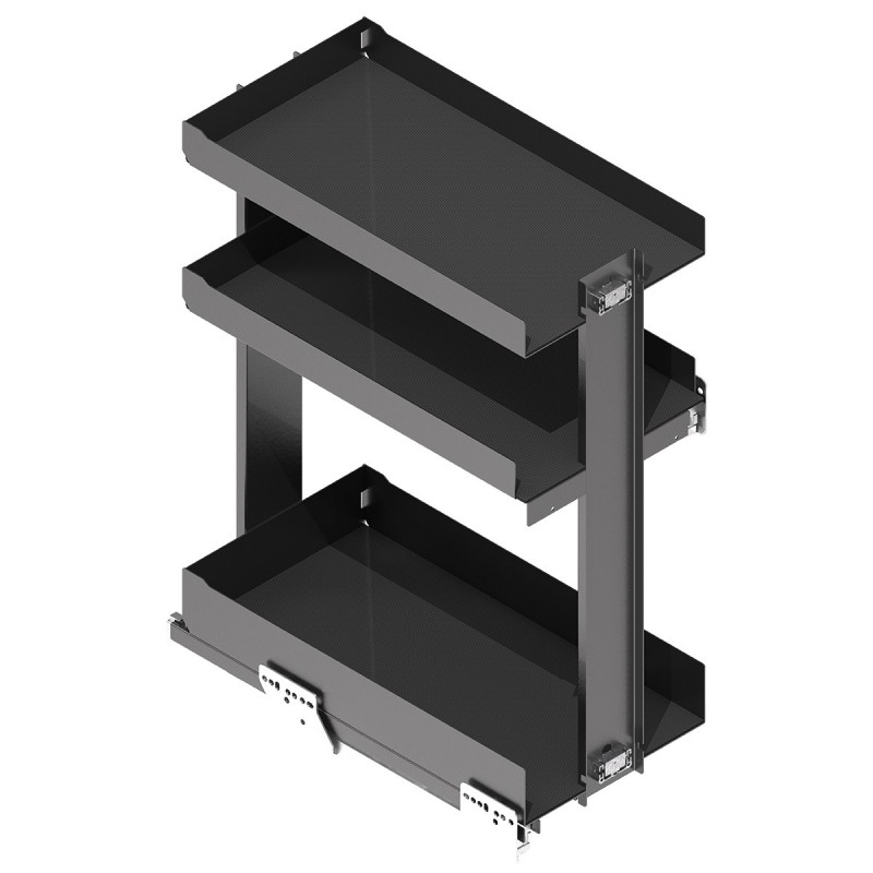 Porte-bouteilles extractible à 3 niveaux Nova Flat en acier finition anthracite avec bases antidérapantes, guides basaux cachés, extraction totale et fermeture amortie.