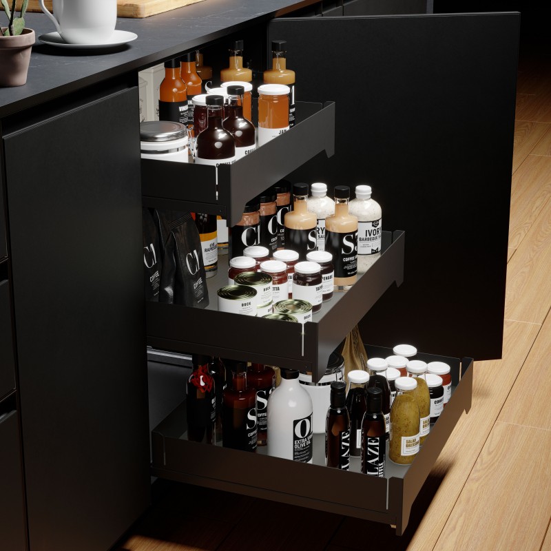 Panier extractible Nova Flat pour meuble de cuisine en acier finition anthracite avec base antidérapante et glissières invisibles à extraction totale et fermeture amortie.