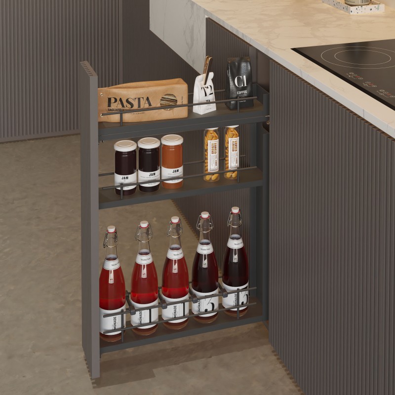 Porte-bouteilles amovible Compact couleur anthracite de 3 hauteurs avec bases en mélamine, glissières cachées, extraction totale et fermeture amortie pour charge dynamique jusqu'à 30 kg.