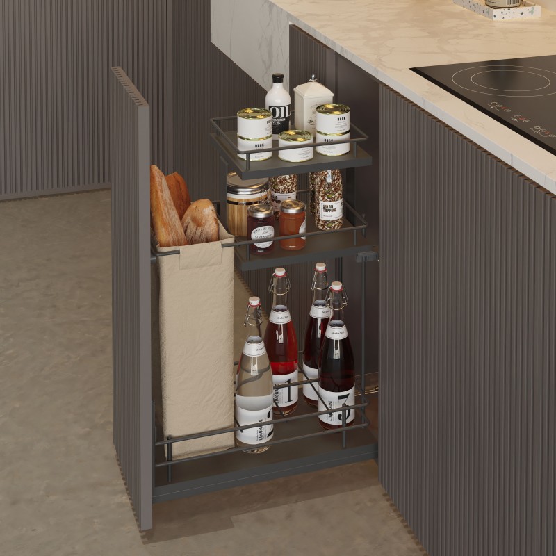 Module extractible gamme Compact anthracite pour meuble de cuisine pour le rangement de bouteilles, bocaux, épices et petits récipients. Inclus également un sac en tissu pour placer le pain.