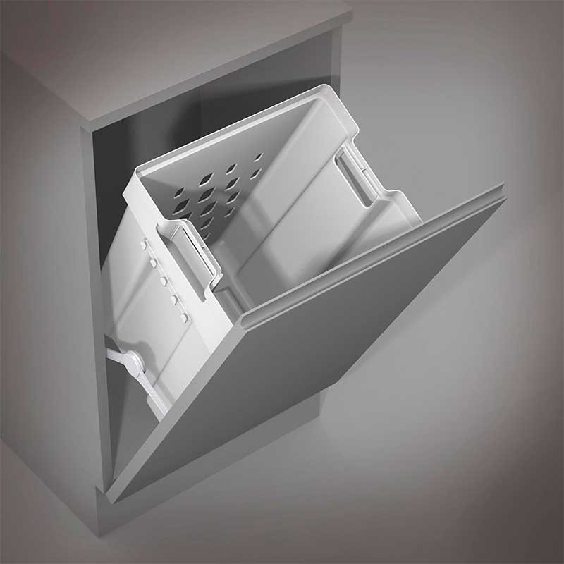 Panier à linge pliant en plastique blanc avec charnière compas à installer sur la porte de modules de 450 mm de large.