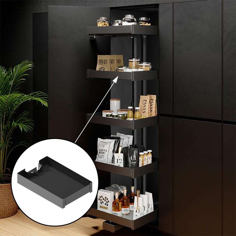 Colonne extractible garde-manger Titán Nova Flat fabriquée en acier finition anthracite avec bases antidérapantes, guides d'extraction totale et fermeture amortie.