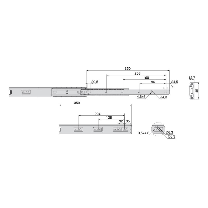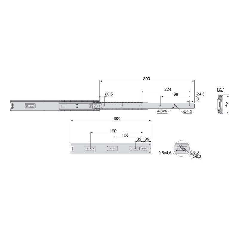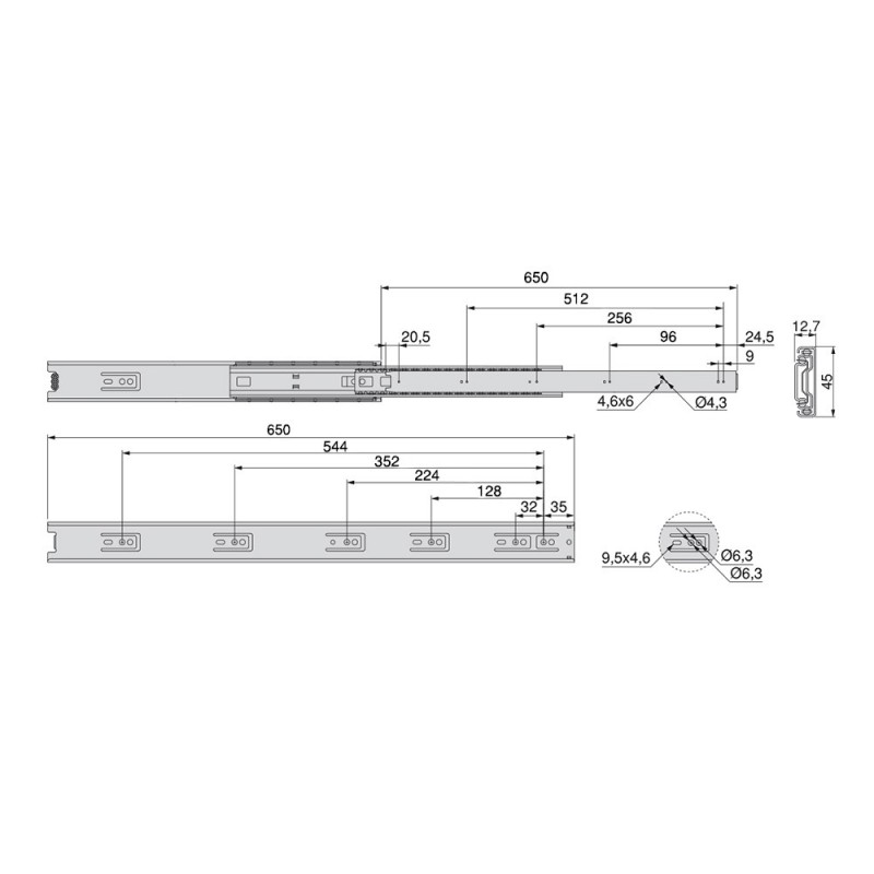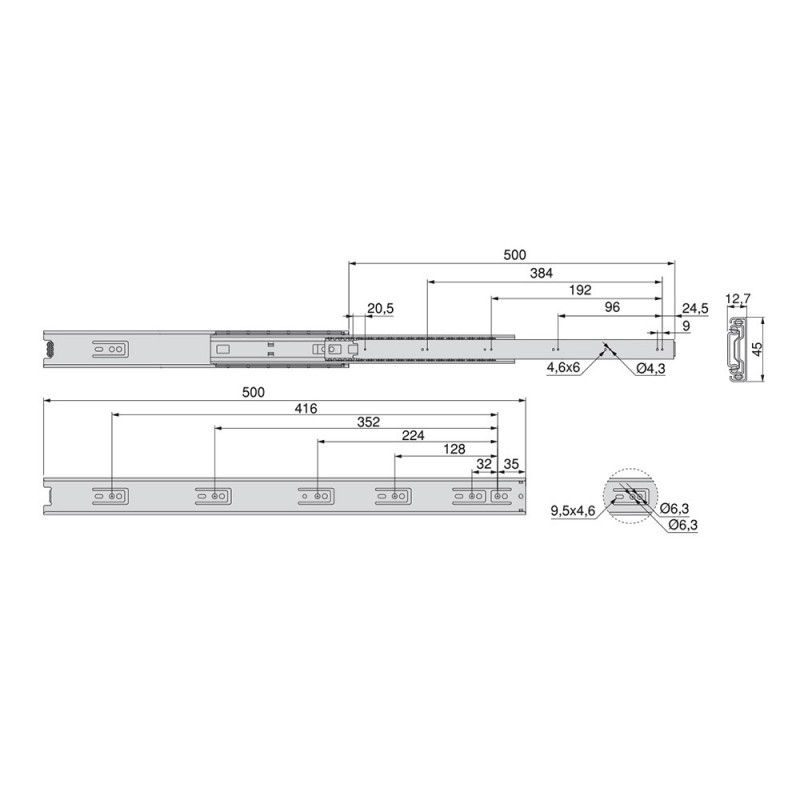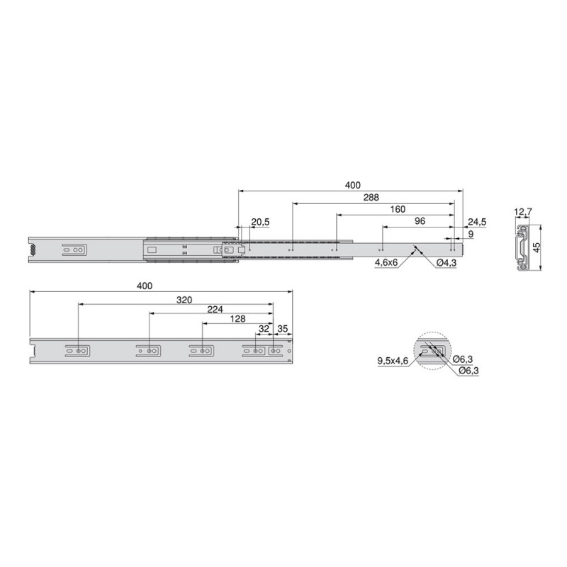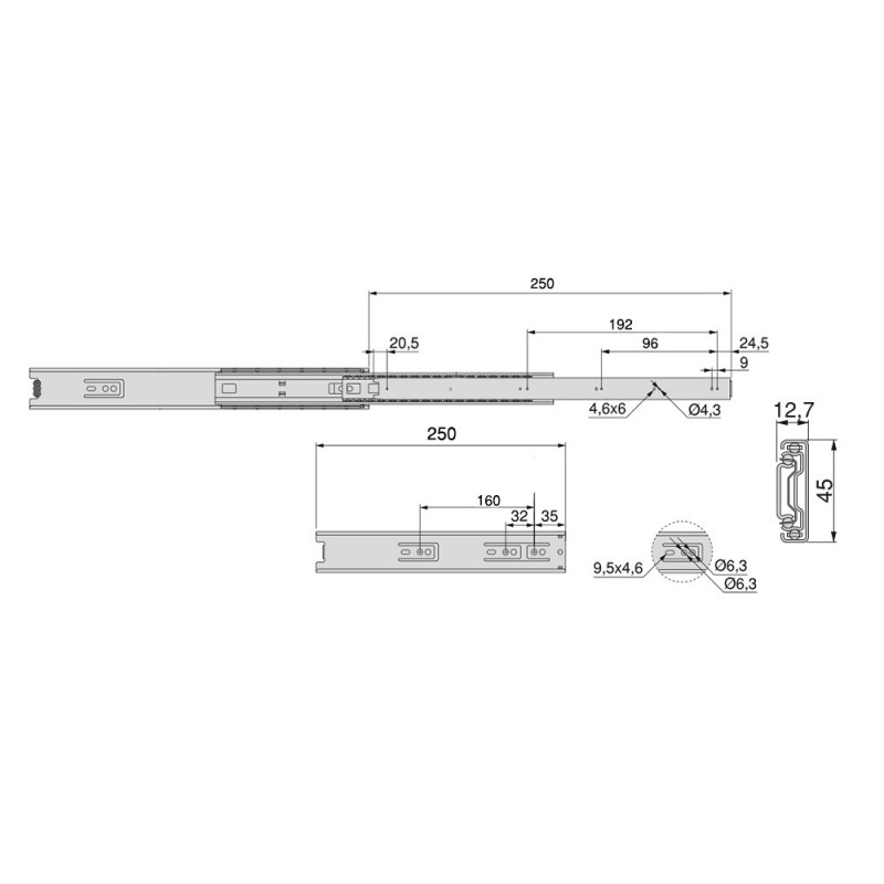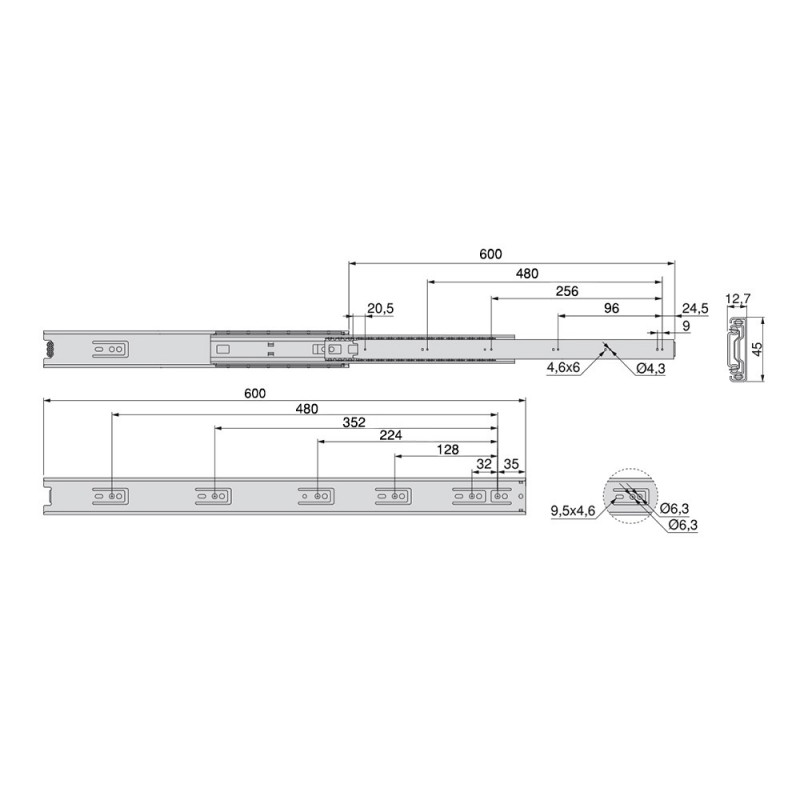 Guides de boules avec plein d'extraction faite d'acier galvanisé. Ce genre de guide est adaptable à un logement de 45 mm de largeur sur le côté du tiroir. Il est fixé sur le côté de l'armoire à l'aide de vis (non inclus) et un déclencheur pour le démontage. Charge maximale de 45kg.