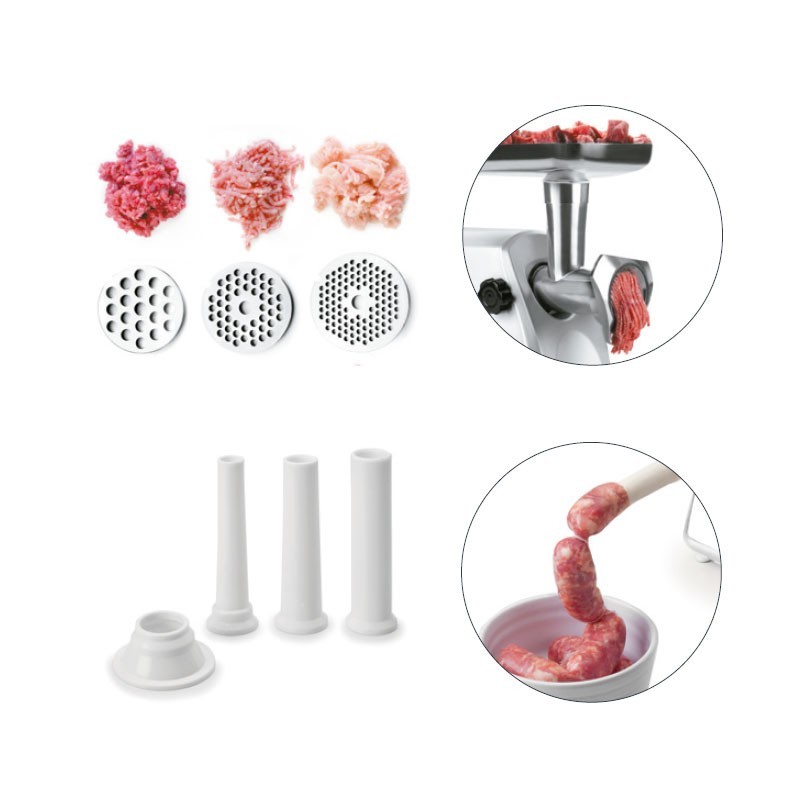 Électrique hachoir à viande Professionnel, avec un corps de fonte d'aluminium, 3 disques perforés en acier inoxydable et 4 accessoires supplémentaires.