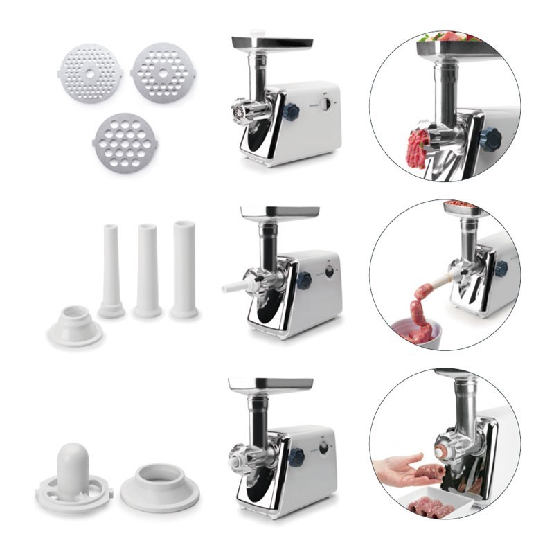 Électrique hachoir à viande modèle Hacher semi-professionnel 300 W avec 3 disques interchangeables en acier inoxydable des planches à découper en différentes tailles.