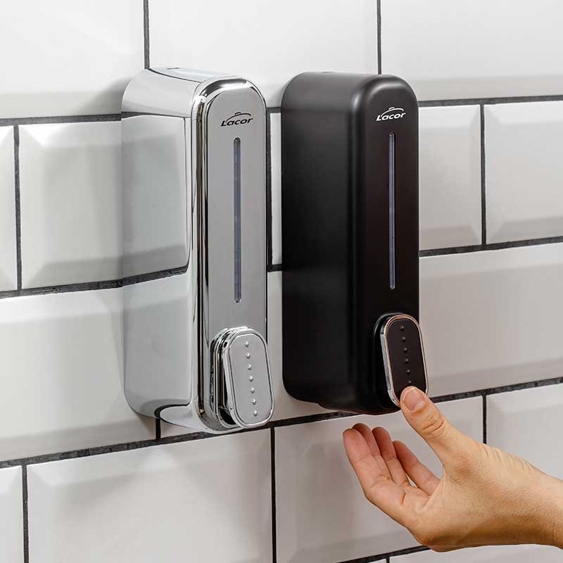 Distributeur de savon ou de gel hydroalcoolique fabriqué en ABS noir avec réservoir en polyéthylène de 350 ml de capacité.