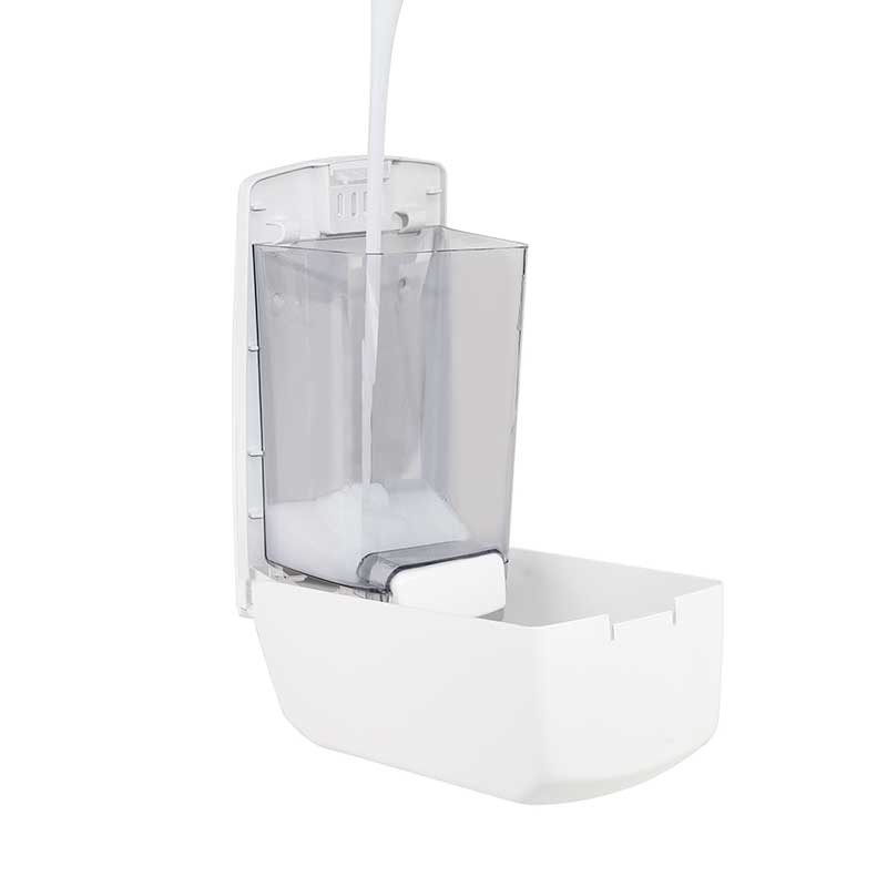 Distributeur de savon ou de gel hydroalcoolique fabriqué en ABS blanc avec un réservoir amovible de 1,1 litre de capacité.