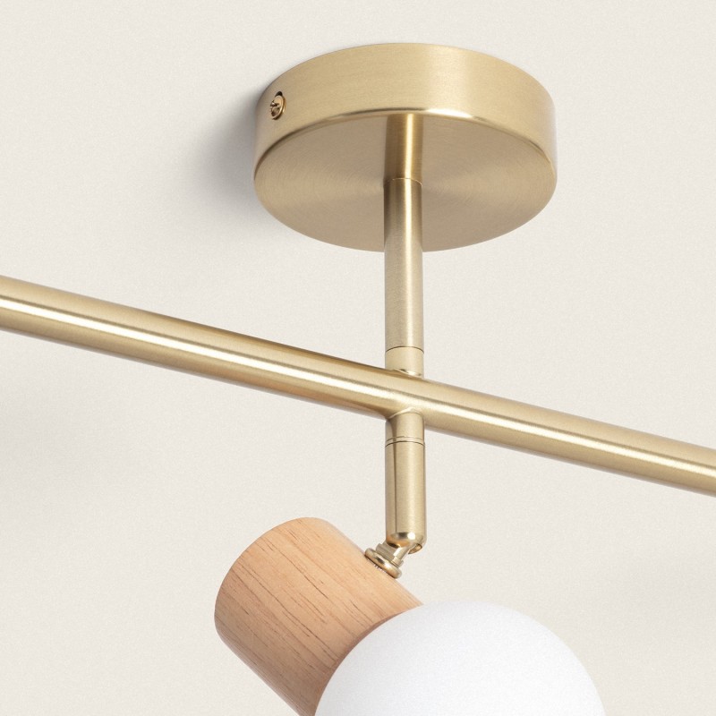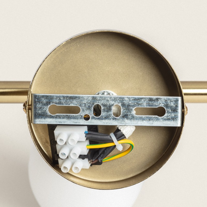 Cette lampe a un corps principal rigide attaché à la fleur, en métal avec une finition dorée. Il complète son design avec trois écrans sphériques en verre blanc mat et une lentille opale, garantissant une dispersion uniforme de la lumière. Les tulipes sont adressables, ce qui permet d'ajuster la source de lumière au besoin.