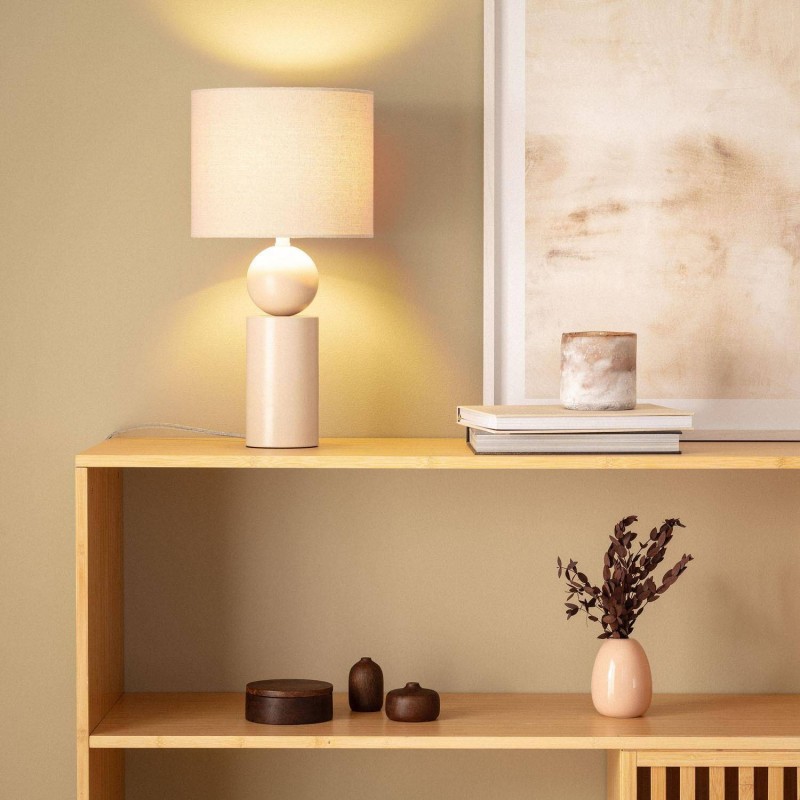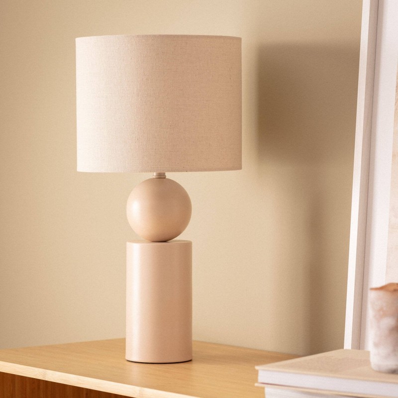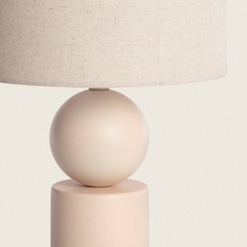 Cette lampe se distingue par son design simple mais élégant. La base en céramique a des finitions qui évoquent deux figures géométriques unies, alliant simplicité et élégance dans son ton beige. L'abat-jour en tissu dissipe uniformément la lumière, créant une atmosphère chaleureuse et relaxante dans n'importe quel espace familial.