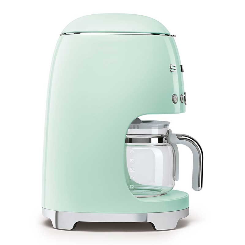 Cafetière goutte à goutte-filtre Style Smeg 50 avec sélection réglable de l'intensité du café et corps en acier inoxydable et finition vert brillant à l'eau ABS.