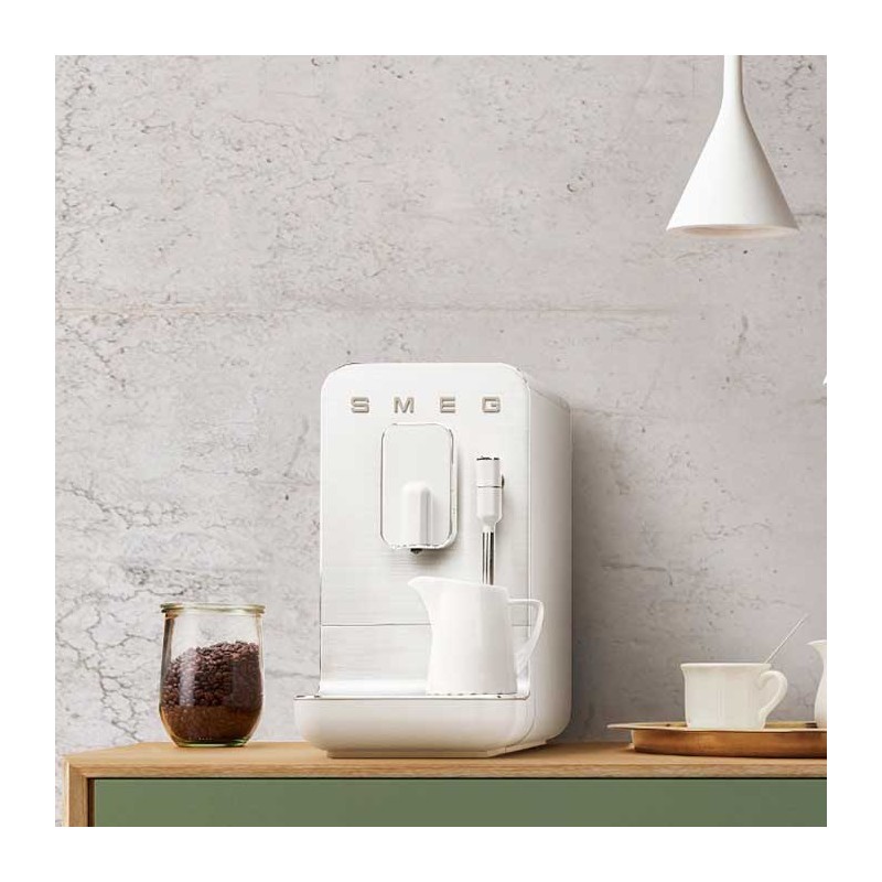 Machine à café Expresso super automatique avec vaporisateur Smeg 50's style Finition blanche mate avec pression de 19 bars et système de chauffage Thermoblock.