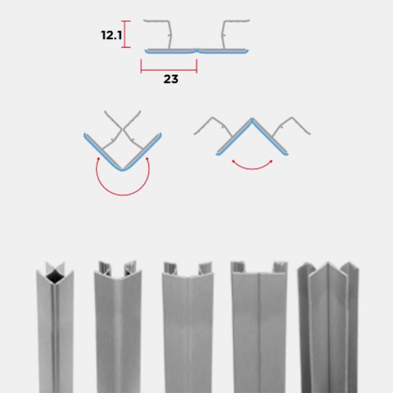 Angle flexible variable de 10 ou 15 cm de hauteur pour plinthe en PVC fabriquée dans ce même matériau avec feuille d'aluminium finition or.