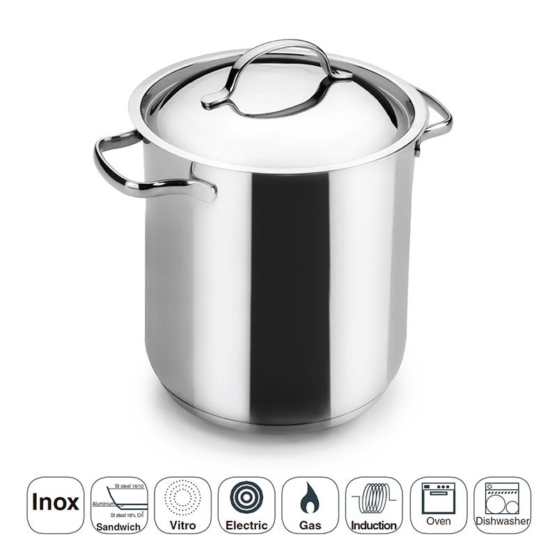 Pot super-haute modèle de Base est fabriqué en acier inoxydable avec fond termodifusor sandwich convient pour les plaques à induction, plaques de cuisson électriques et des cuisinières à gaz.