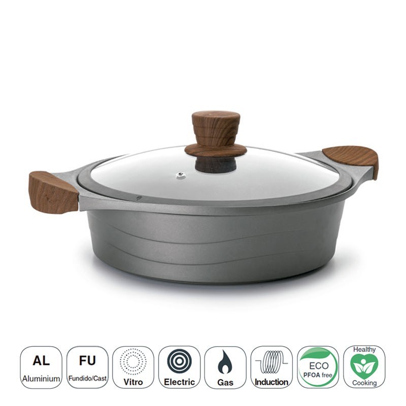 Casserole peu profonde pour la cuisine, pour le modèle de Stilo fabriqué en fonte d'aluminium avec couvercle en verre convient pour les plaques à induction, plaques de cuisson électriques et des cuisinières à gaz.