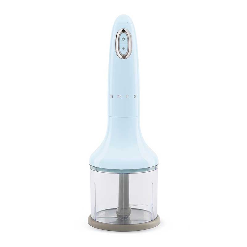 Mélangeur à main Smeg 50's style ciel bleu finition brillante avec ensemble d'accessoires inclus, 700 W, vitesse variable et fonction turbo.
