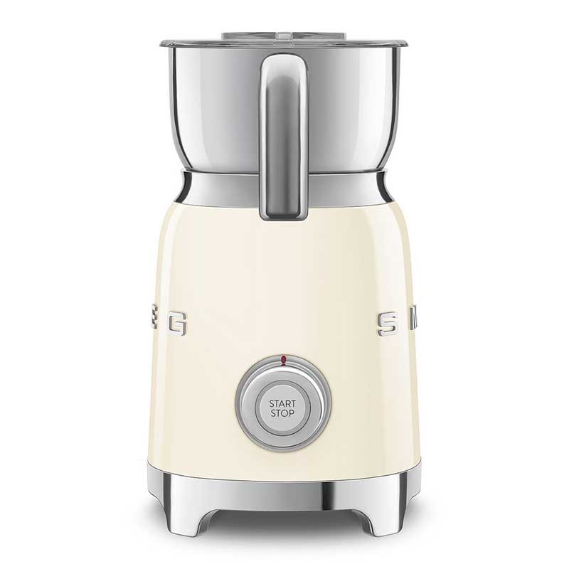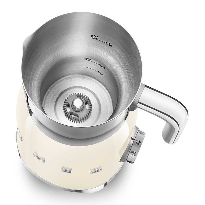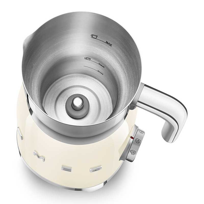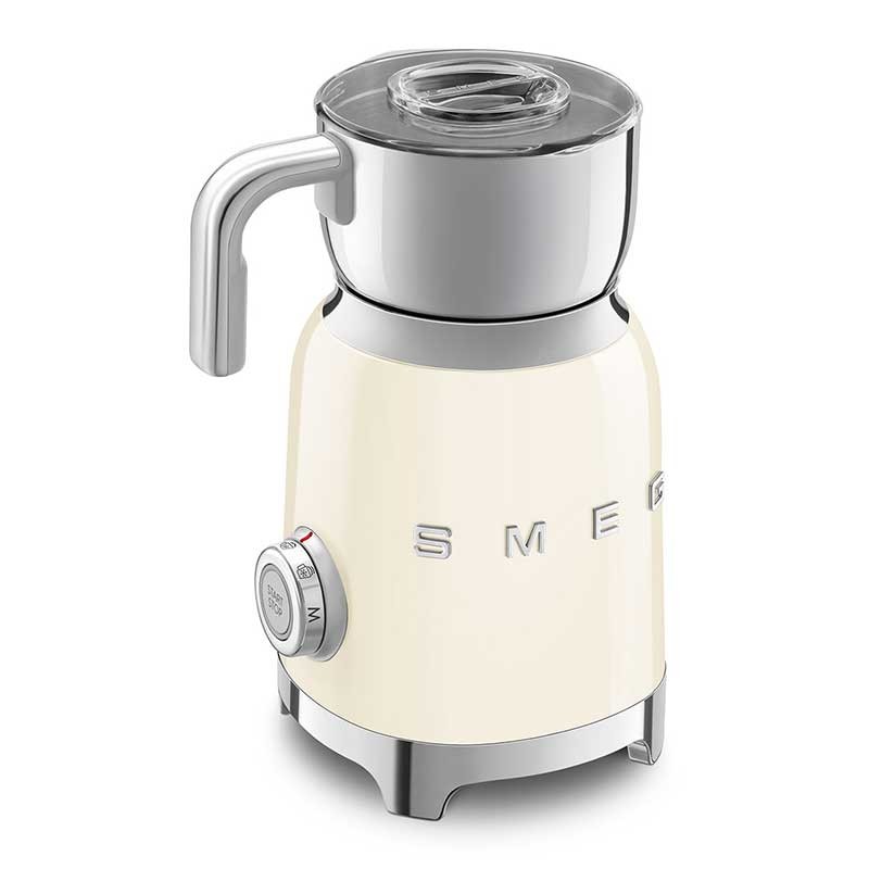 Mousseur à lait style Smeg 50's avec corps en acier inoxydable finition crème brillante et 6 programmes pour préparer des boissons chaudes ou froides avec ou sans mousse.