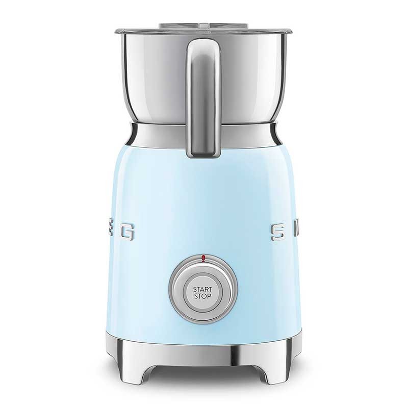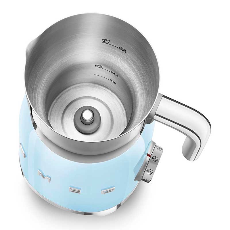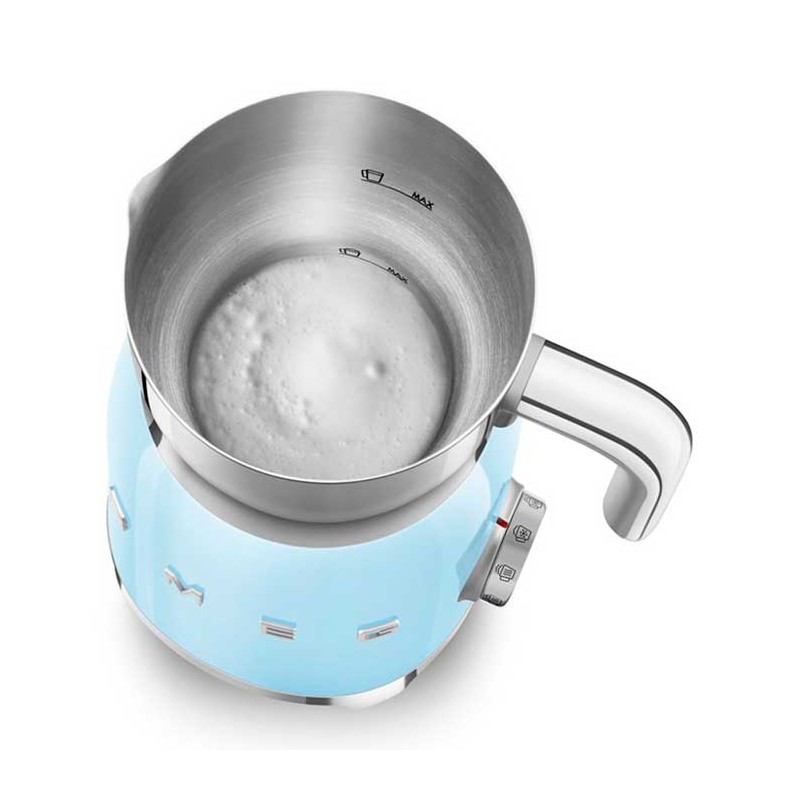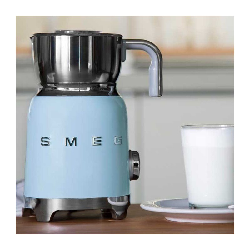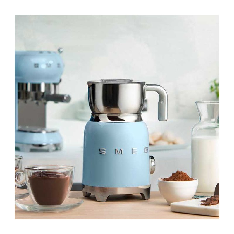 Mousseur à lait style Smeg 50's avec corps en acier inoxydable avec finition brillante bleu ciel et 6 programmes pour préparer des boissons chaudes ou froides avec ou sans mousse.