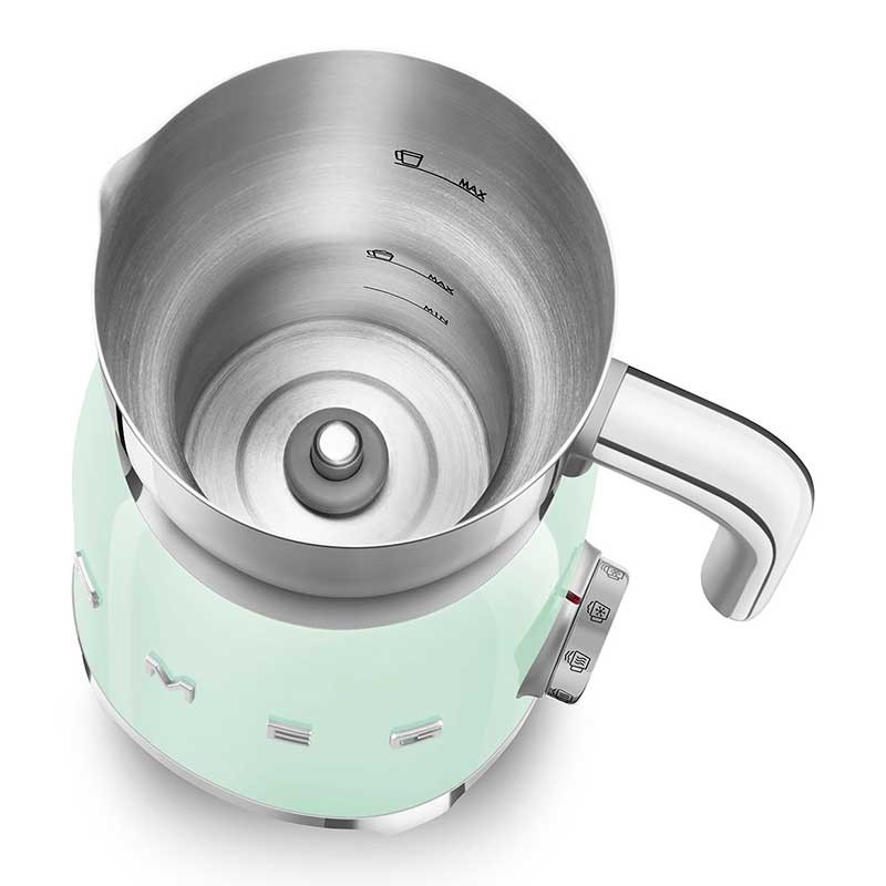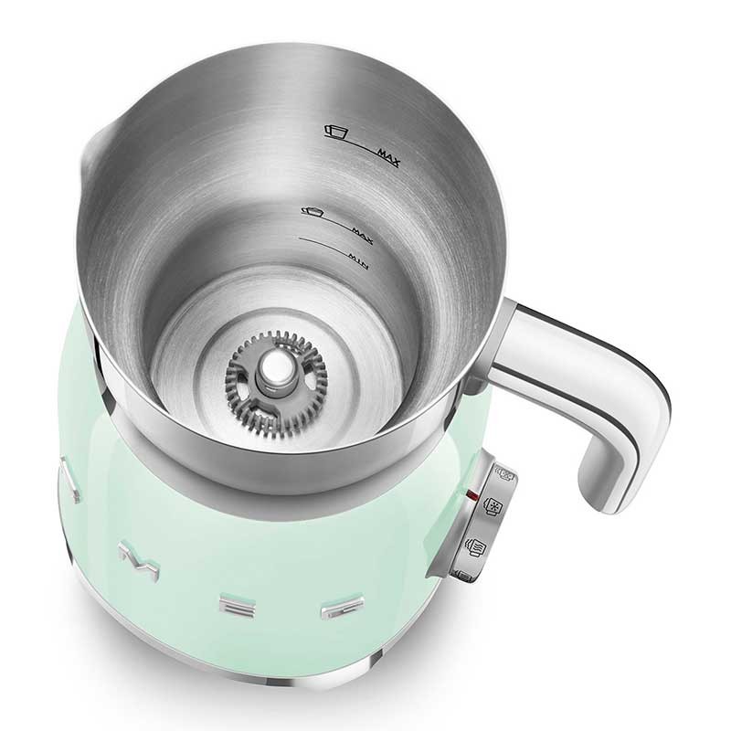 Mousseur à lait style Smeg 50's avec corps en acier inoxydable avec finition green water gloss et 6 programmes pour préparer des boissons chaudes ou froides avec ou sans mousse.