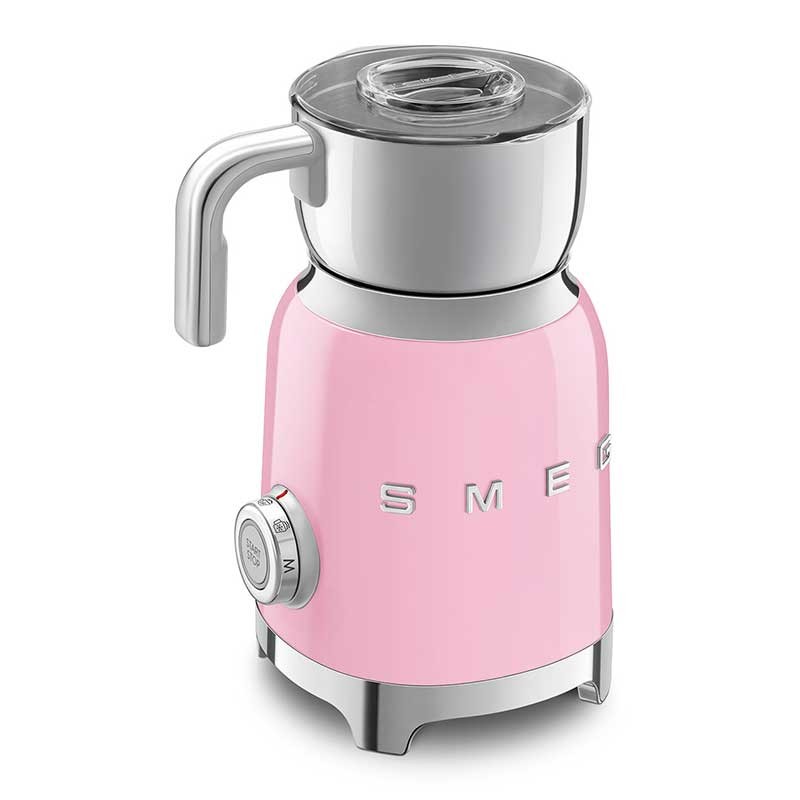 Mousseur à lait style Smeg 50's avec corps en acier inoxydable au fini rose brillant et 6 programmes pour préparer des boissons chaudes ou froides avec ou sans mousse.