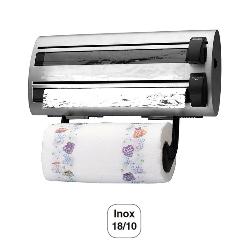 Porte-rouleau de cuisine 3-en-1 ovale à installer sur le mur et distribuer du papier de cuisine, la de film alimentaire et le papier aluminium. Il est fabriqué en acier inoxydable 18/10 de haute qualité et résistance à la corrosion.