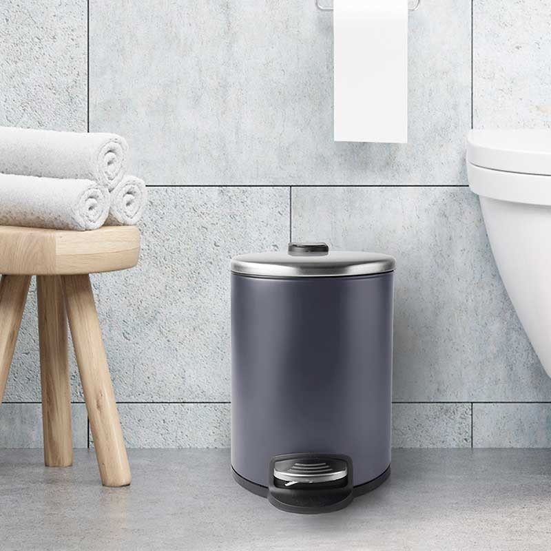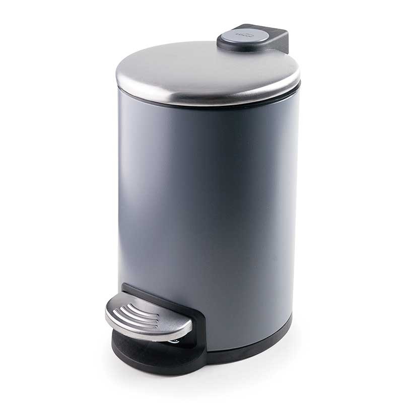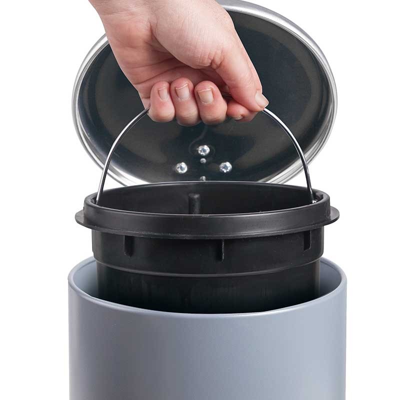 Poubelle de 3 litres en acier inoxydable gris avec ouverture du couvercle par pédale et cuve intérieure extractible en polypropylène avec anse.