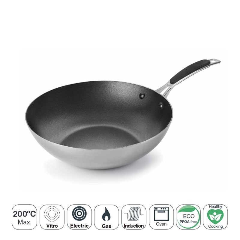 Wok avec revêtement anti-adhésif modèle trimétallique créé fabriqué avec 3 couches (2 en acier inoxydable et aluminium 1) de première qualité, convenant à tous les types de cuisines.