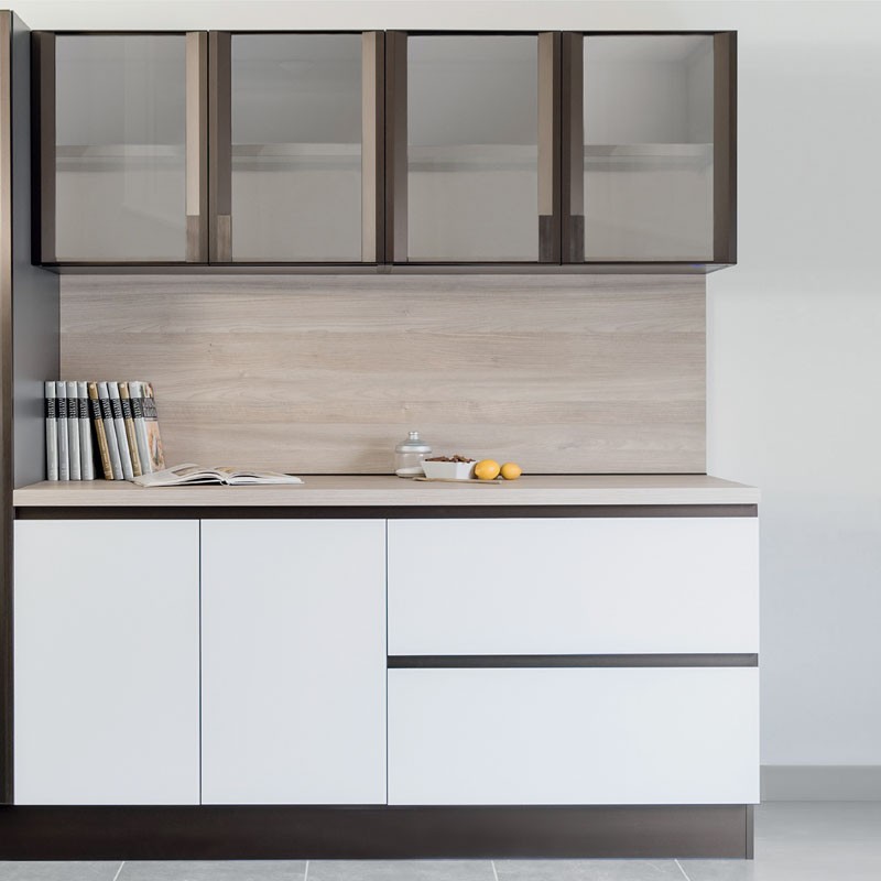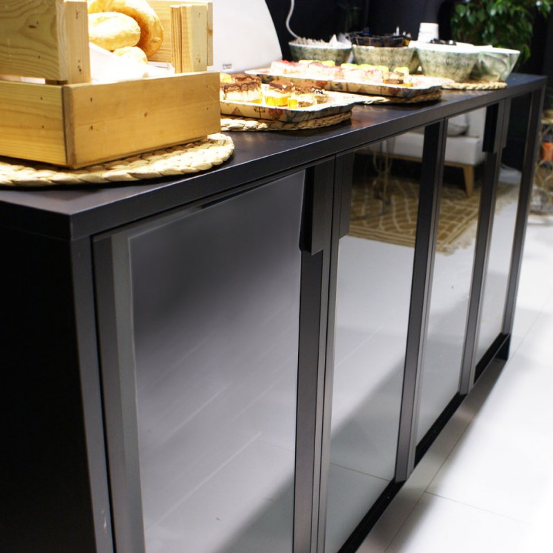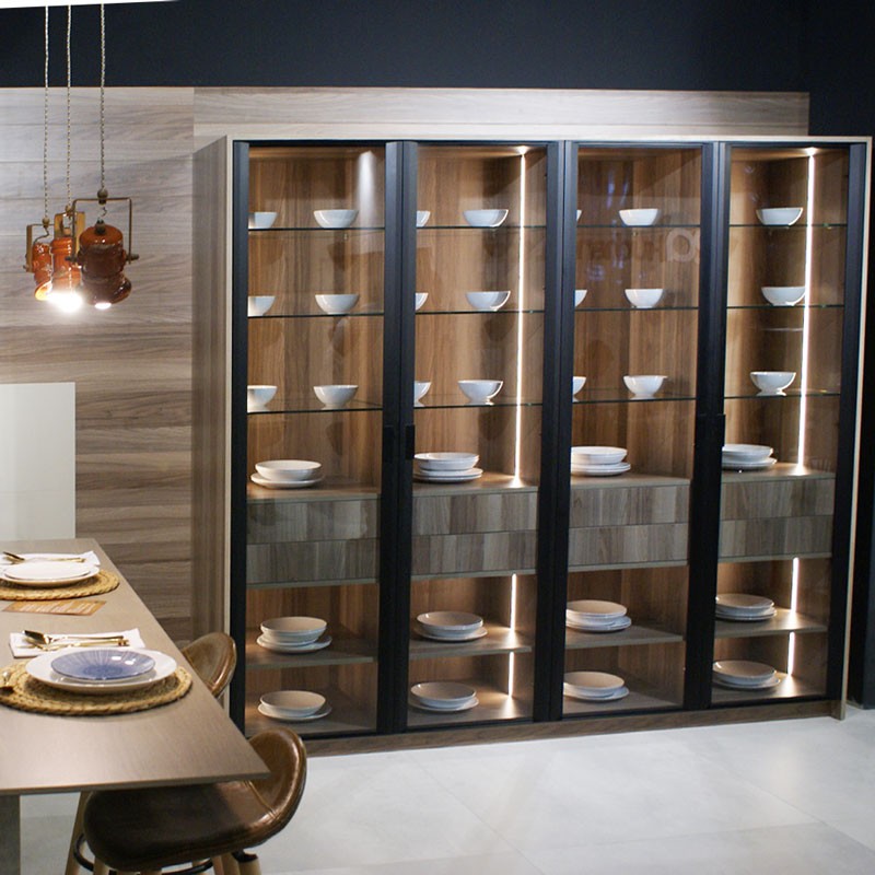 Système de vitrines sans équerre. Les profils supérieur et inférieur sont assemblés à 90º aux profils verticaux. Spécial pour les modules de colonne.