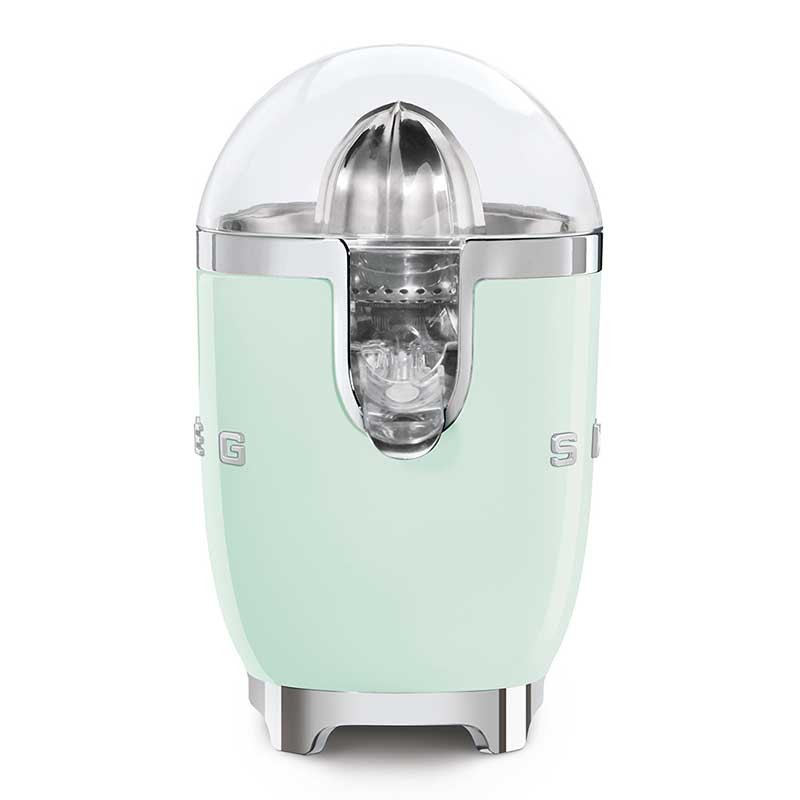 Presse agrumes manuel Smeg 50 Style 70W avec corps en fonte d'aluminium finition brillante à l'eau verte et cône en acier inoxydable.