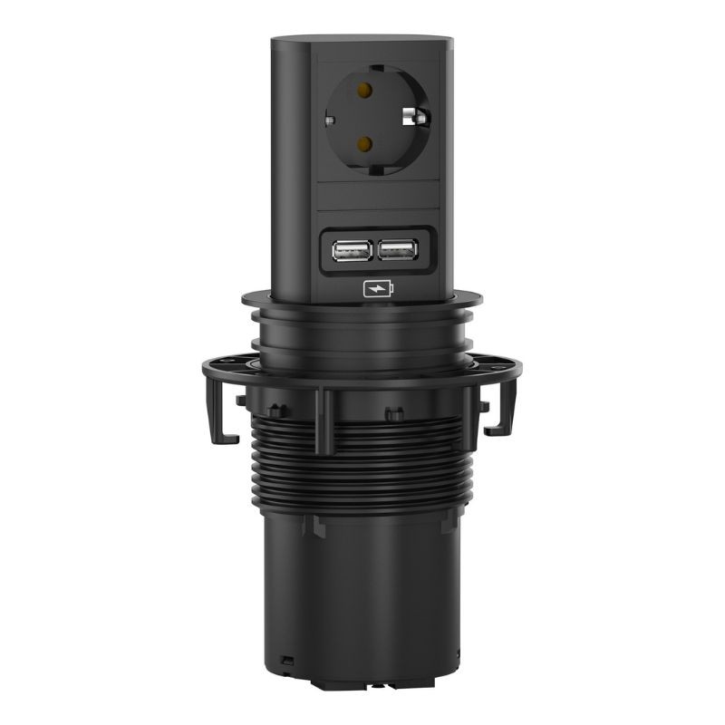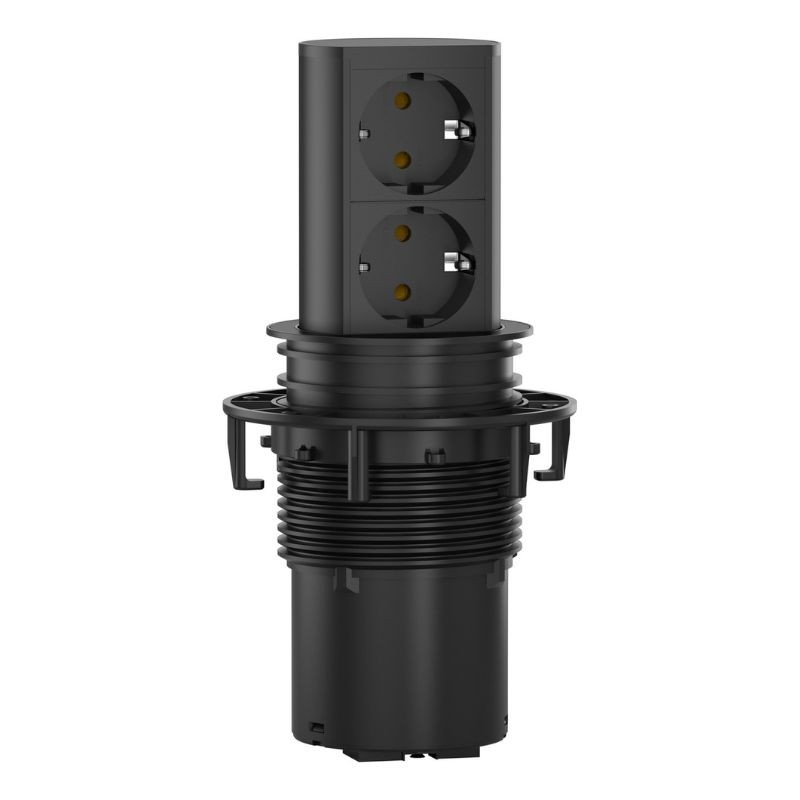 La tour de prises pour cuisine Elevator noir mat est idéale pour être installée sur les plans de travail, bien qu'elle s'adapte de manière optimale à tout environnement. Elle est très appropriée quand il s'agit d'intégrer des connexions de courant et de données dans un espace réduit.
