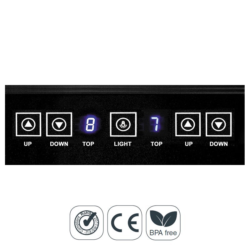 La température à l'intérieur de l'armoire refroidisseur dépendra de la température ambiante à l'extérieur de l'enceinte. Pour les vins rouges de la gamme de température idéale se situe entre 14 et 16 ° c, tandis que pour les vins blancs, ou cavas, il est recommandé qu'ils sont entre 6 et 10,5 ºC. La température à l'intérieur peut être facilement ajusté par le contrôle électronique de la température dans le haut de l'armoire.