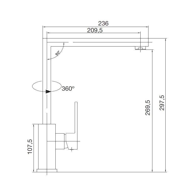 Poignée simple robinet de modèle Maya Carré de 29,7 cm de hauteur, rotation 360 et fini en chrome pour évier de cuisine. Cartouche en céramique de 25 mm montage vertical sur le plateau.