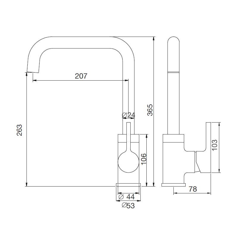 Poignée simple robinet de modèle Salomé 36,5 cm de hauteur et fini en chrome pour évier de cuisine. Cartouche en céramique 35 mm montage vertical sur le plateau.