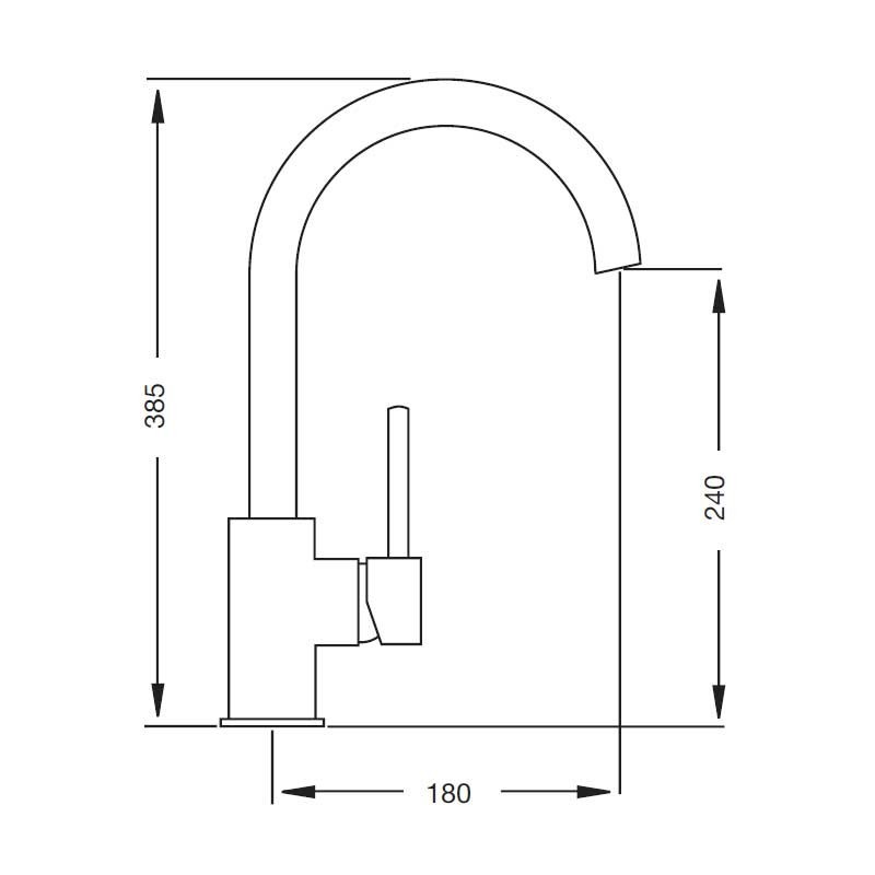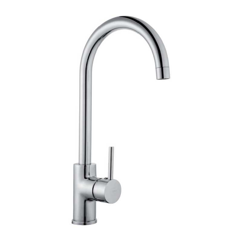 Poignée unique robinet bec courbé modèle Iris 38.5 cm de hauteur et fini en chrome pour évier de cuisine. Cartouche en céramique 35 mm montage vertical sur le plateau.