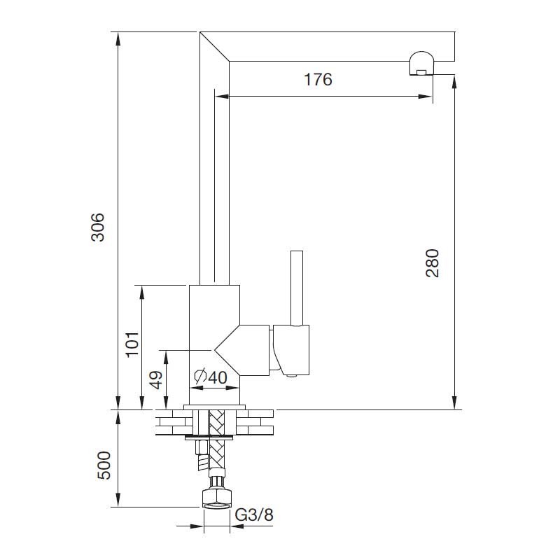 Poignée simple robinet de modèle de l'Escouade de 30,6 cm de hauteur et fini en chrome pour évier de cuisine. Cartouche en céramique 35 mm montage vertical sur le plateau.