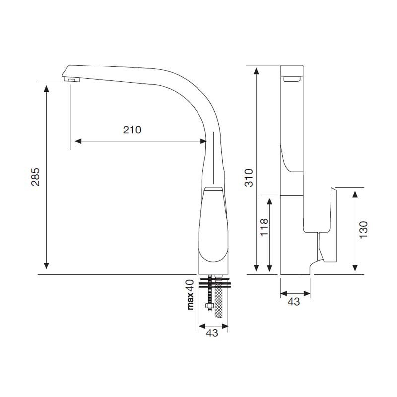 Poignée simple robinet de modèle Venus de 31 cm de hauteur et fini en chrome pour évier de cuisine. Cartouche en céramique 35 mm montage vertical sur le plateau.