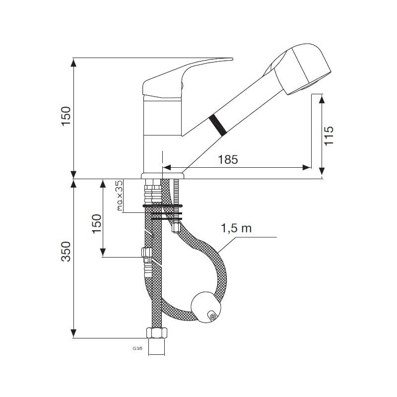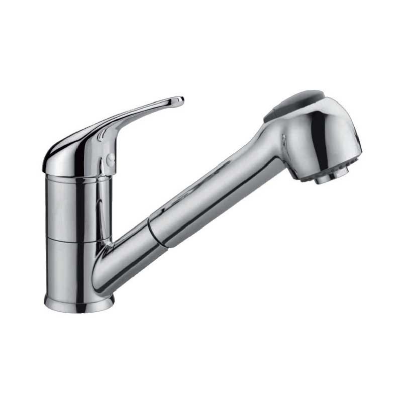Poignée unique robinet verseur avec une faible douche amovible modèle Standard de 15 cm de hauteur et fini en chrome pour évier de cuisine. Cartouche céramique de 40 mm montage vertical sur le plateau.